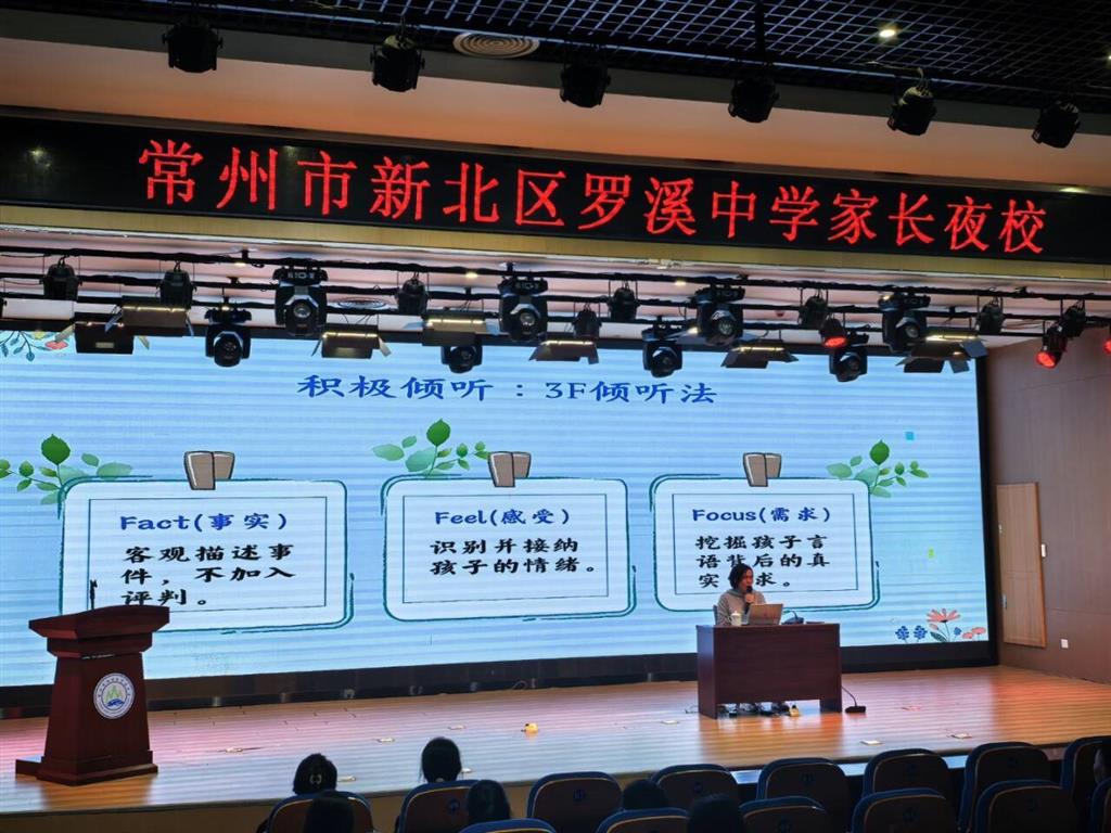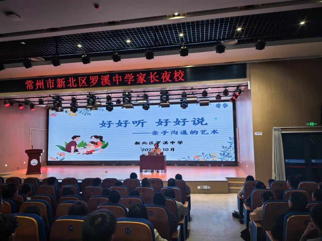 2025年10月30日晚,秋雨绵绵,罗溪中学的报告厅内却暖意融融。一场以“ 好好听,好好说”为主题的家长夜校活动如期而至,吸引了众多渴望提升亲子沟通质量的家长前来赴约。学校荣幸地邀请到新北区家庭教育指导中心特聘专家唐小燕老师,为家长们带来一场充满智慧与温情的亲子沟通艺术课,共同解码青春期孩子的心世界,为家庭教育的困惑点亮一盏明灯。