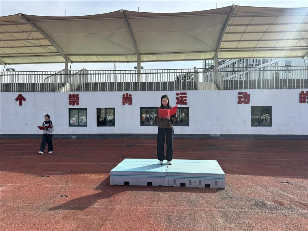 本次升旗仪式由八6班薛妙涵同学主持,她在致辞中提到,半学期时光已从初秋走向暮秋,同学们在课堂求知、练习巩固与互助共进中积累知识。期中检测不仅是对半学期学习成果的检验,更是对意志品质与学习方法的综合考量,号召大家以饱满热情迎接挑战。